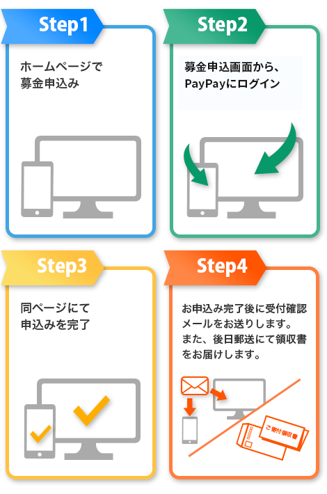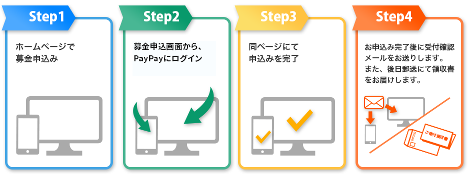 - ご寄付は、お申込み日の翌月末に収納代行会社、または、ソフトバンクから当協会へ入金されるため、領収書の送付は翌々月初めになります。