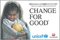 日本航空の国際線(コードシェア便を除く全路線)や国内線では、ユニセフ外国コイン募金へのご協力を呼びかけています。機内に用意されている封筒「Change for Good®(チェンジフォーグッド)」に入れて、客室乗務員にお渡しください。