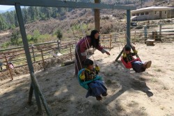 5才の双子ニマチャンとダワチャンと教師のペマ・エデンさん。センターの庭にある遊具は親たちが設置した。 |