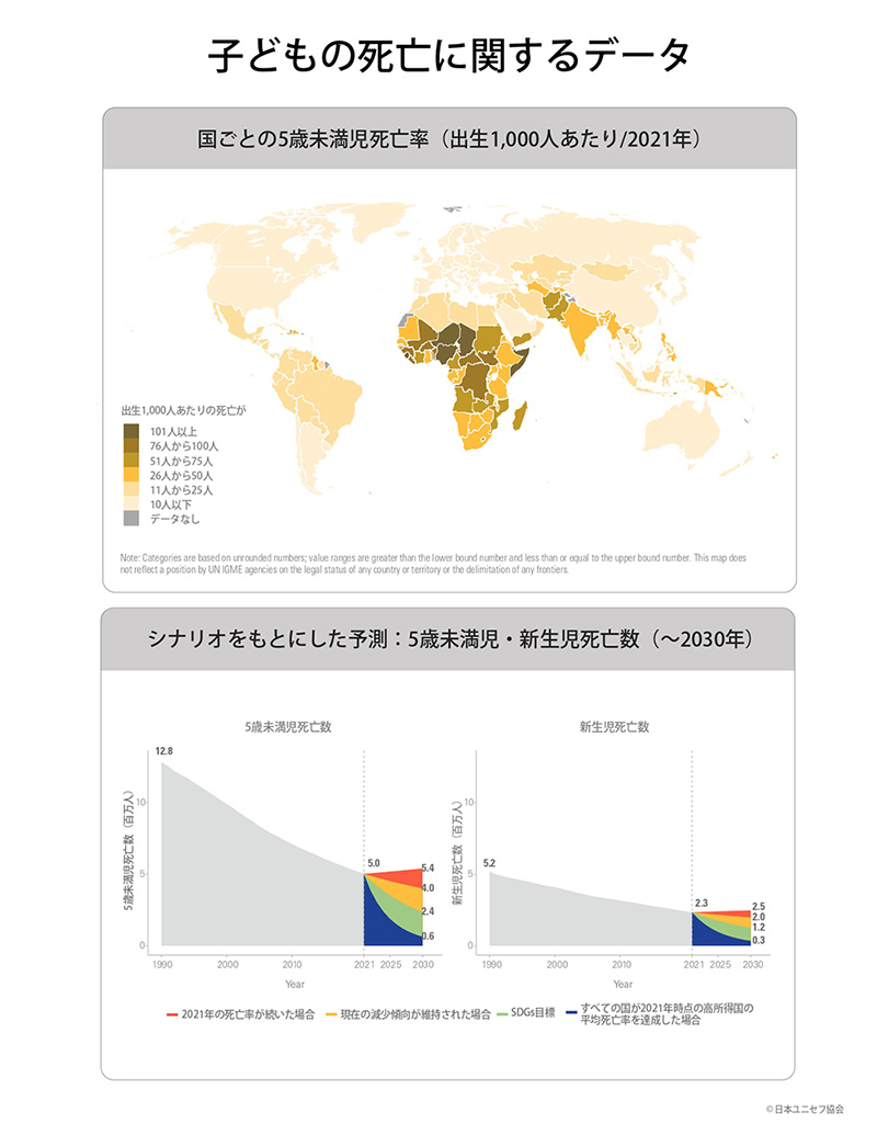 - 2023年時点で、生後28日以内に命を落とす新生児は年間230万人。1日に約6,300人の新生児が命を落としている。5歳未満児死亡のうち、新生児死亡(生後28日以内に死亡)が占める割合は48%。