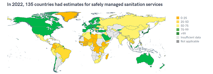 下記の地図は、安全に管理された衛生施設(トイレ)を利用できる人の割合(2024年)を各国毎に色で示しています。