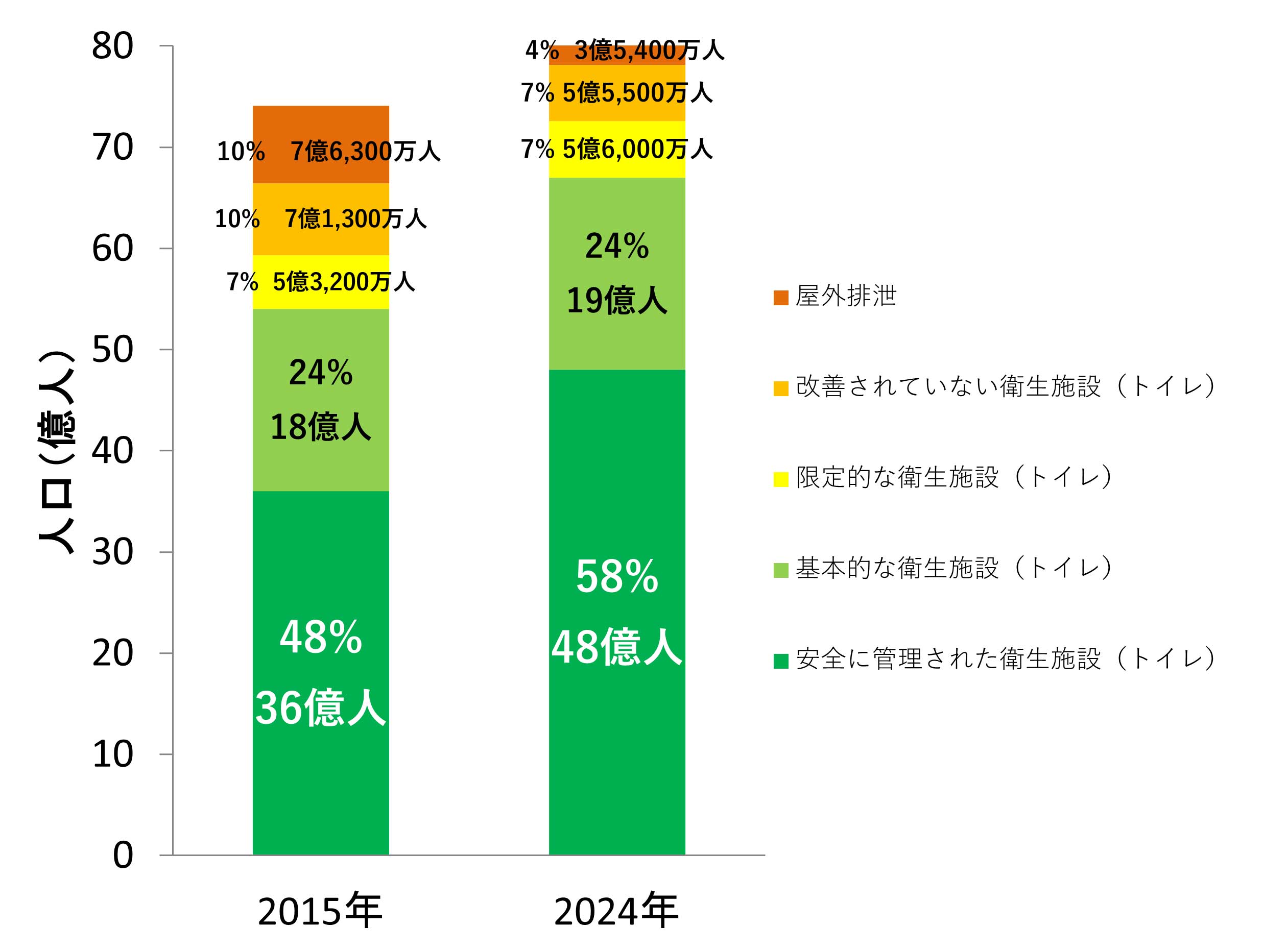 世界で安全に管理された衛生施設(トイレ)を利用できる人の割合は、48%(2015年)から58%(2024年)まで改善しています。