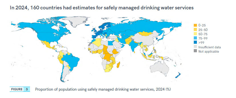 下記の地図は、安全に管理された飲み水を利用できる人の割合(2024年)を、各国毎に色で示しています。
