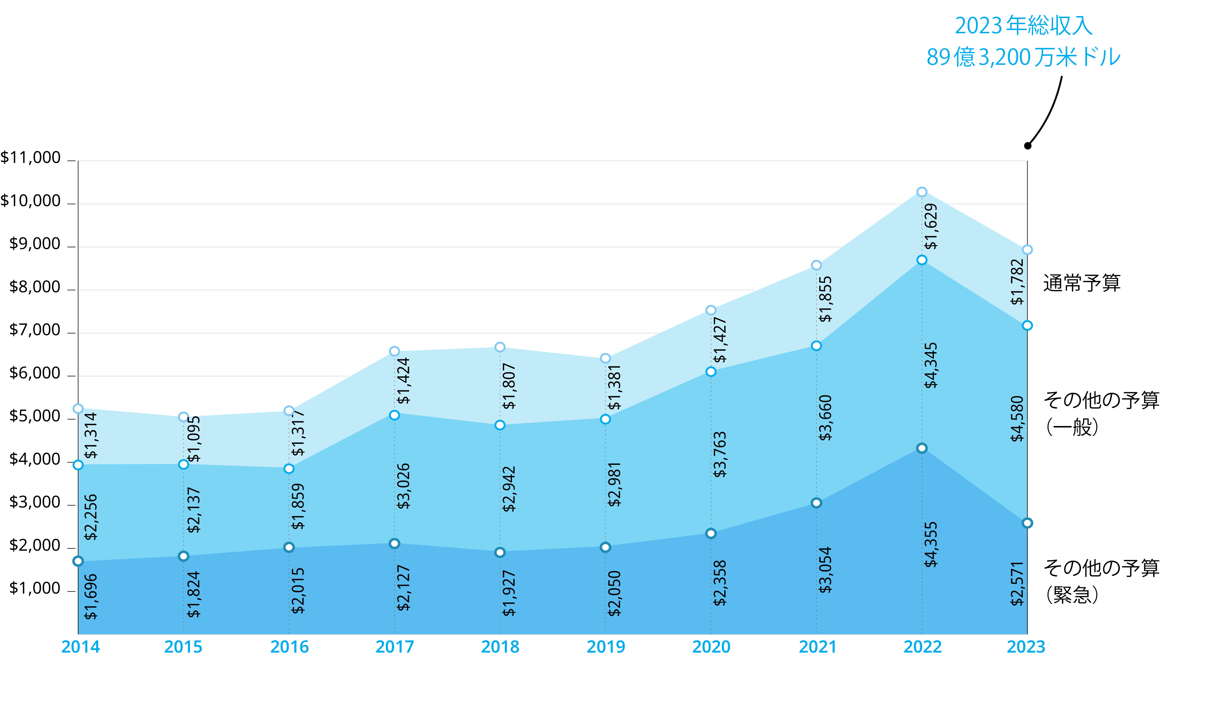 ユニセフの予算は、支援先の国や地域、分野を限定しない「通常予算(Regular Resources)」と、緊急・人道支援を含む国や地域、プロジェクトを指定する「その他の予算(Other Resources)」に分かれます。