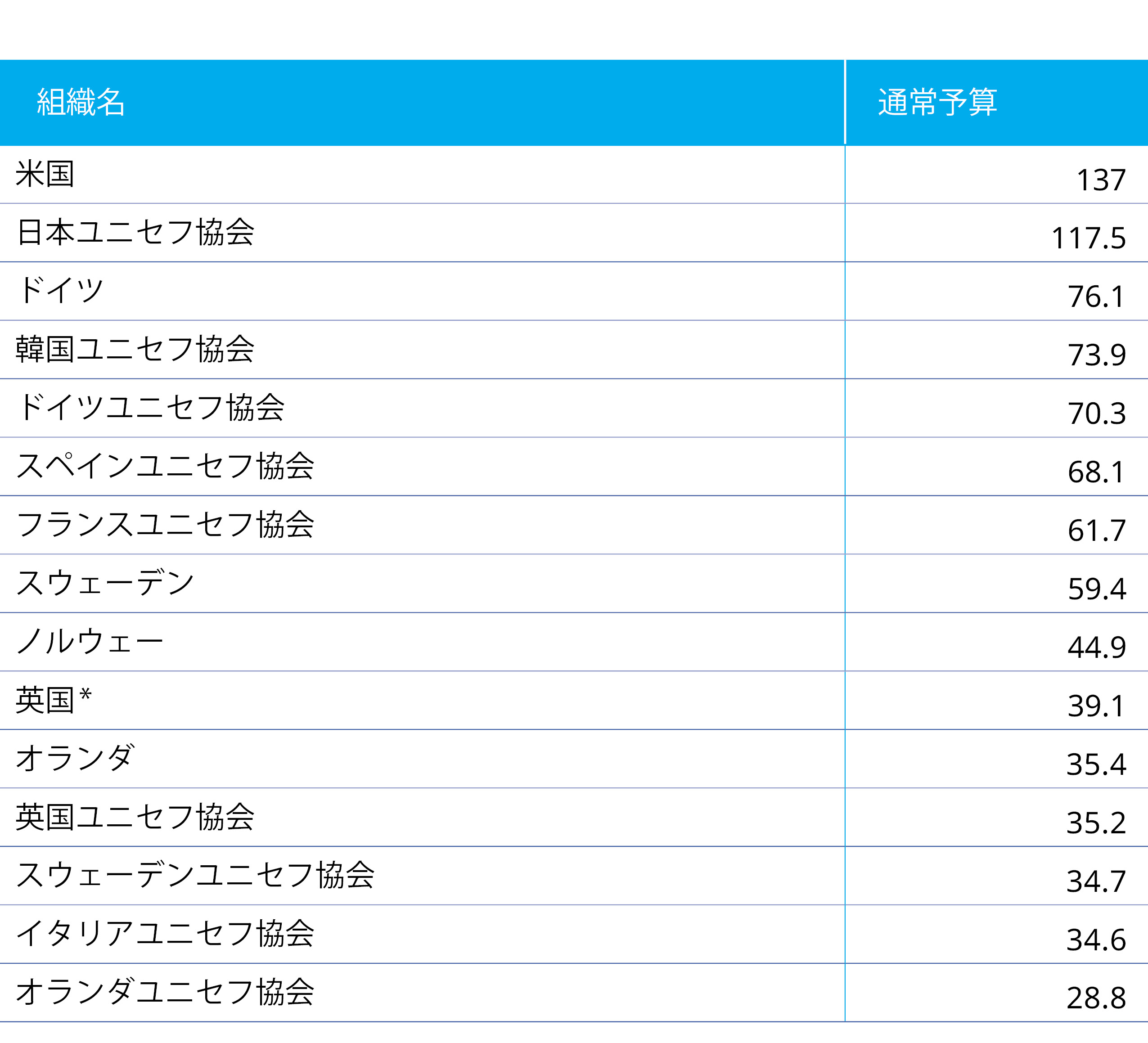 日本ユニセフ協会が日本の皆さまからお預かりしユニセフへ拠出した募金のうち、通常予算への拠出額は、米国政府を上回り最多となりました。皆さまから寄せられたあたたかいご寄付によるものです。