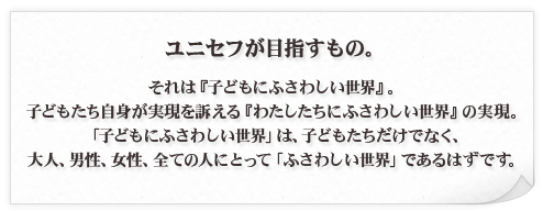 1990年に開催された「子どものための世界サミット」(世界の首脳会議としては当時史上最多の世界71ヶ国の首脳が参加)から10年。国連子ども特別総会では、サミットで合意された数々の約束が、どこまで達成されたかを見直すと同時に、その後10年に世界各国政府などが取るべき行動が話し合われ、約束されました。