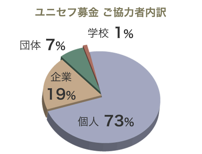 日本におけるユニセフ募金の大きな特徴のひとつは、「個人」のご支援者さまの割合が非常に高いことです。また、企業や団体の皆さまからも、特定の分野やプロジェクトへの指定募金を中心に、長期的な支援をいただいています。