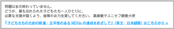この2冊の報告書、『目標達成のための格差の是正(Narrowing the Gaps to Meet the Goals)』と『子どもたちのための前進:公平性のあるMDGsの達成をめざして(Progress for Children: Achieving the MDGs with Equity)』は、また、ユニセフがまとめた最新の数値を紹介しています。