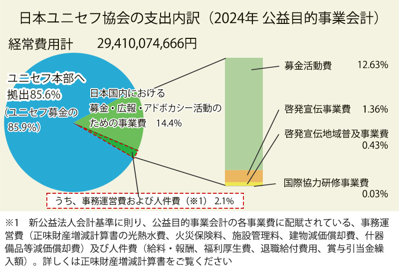 2024年、当協会は、251億6,200万円をユニセフ本部に拠出しました。これは、経常費用計294億1,007万4,666円の85.6%(みなさまからお寄せいただいた募金292億9,585万2,400円の85.9%*)にあたります。経常費用計の14.4%は、ユニセフ本部との協力協定に基づき、ユニセフ支援の輪を広げるための、国内での募金活動(領収書/寄付控除申請書類の印刷・発送費や振込/決済に係る費用などを含む)、広報・アドボカシー活動、国際協力に携わる人材の育成活動などに充てさせていただきました。そのうち、事務運営費および人件費は2.1%です。