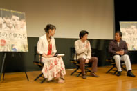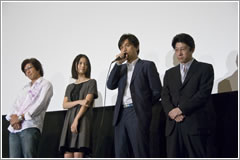 阪本順治さん (監督・脚本 写真右端) 「緊張に満ちた撮影期間でした。」「この映画は、出演者は豪華ですが、昨今の日本映画の流行にのって成立した映画ではありません。是非みなさんで応援してください。」 江口洋介さん(南部浩行役 写真右から2番目) 「最初に脚本(ほん)を読んだとき、テーブルの上に脚本(ほん)を引き離しておきたくなるような時間がありました。でも、3回くらい読んでいるうちに、もう逃げられないなと思いました。こうして形になることすらも想像しづらい、取材でどう語っていいかも思わず考えてしまうような映画でしたが、何らかの形でみなさんの心の中に残っていると思いますので、この映画の意味があったかなと思います。」 |