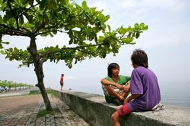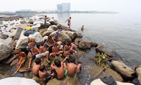 午後、ジョシュアくんたちは、数キロ離れたマニラの港「マニラベイ」に水浴びをしにやってきました。海面はごみや排泄物で汚れていますが、夏の暑い日に涼を取る唯一の方法だと言います。マニラベイには、食べ物もあります。ムール貝や牡蠣を拾い、浜辺で調理して食べるのです。