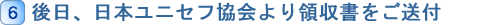 日本ユニセフ協会にて入金を確認後、領収書をご入力頂いた住所にお送りいたします。