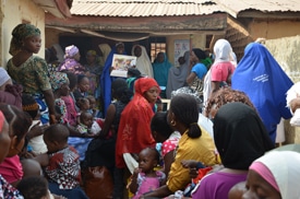 ナイジェリア北部カドゥナ州の保健施設。2列のベンチに、50人ほどの若い母親たちが膝に赤ちゃんをのせて座っています。彼女たちの視線は、ポリオの地域活動員であるリディアさんに注がれています。しかし、リディアさんの今日の役目はポリオワクチンを届けることではありません。母乳育児の正しい方法を母親たちに伝えることです。