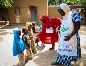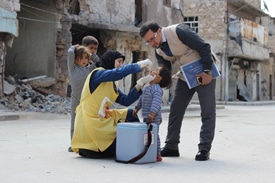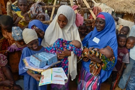 さらに、社会動員活動を行い、紛争地域や遠隔地などでポリオワクチンを拒否する人々にも予防接種の効用を説明し、彼らが望んで接種を受けるよう認識向上に努めています。現地では、ユニセフの支援を受けた地域活動員が、紛争地域を移動する子どもを含むすべての子どもを特定・訪問し、保健従事者とも協力しながらワクチンを届けています。また同時に、子どもの家族に対する出産前のケアを行ったり、医療サービスへのアクセスや石けんによる手洗い、母乳育児など、子どもの命を守るために必要な情報を日々伝えています。