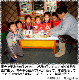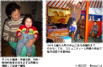 地方ではサービスの平等なアクセスを目標に、地域の遊牧民の0〜7歳のすべての子どもたちを対象に、各家族グループを年間を通して巡回する移動ゲル幼稚園を地元政府と協力して運営しています。この方法の成功の軸となっているのがコミュニティーのボランティアの活躍と親たちの参加です。訓練を受けた地元のボランティアたちが、家庭でもできる乳幼児時期のケアについてきめ細かく両親に教えます。生後何ヶ月になったらどんな反応があるか、笑う・指を握るなど年齢にふさわしい知的・精神的成長があるかどうか、体重は順調に増えているか、栄養不良や病気になっていないかなどを、両親が観察し巡回のコミュニティボランティアともに子どもの成長記録をつけます。ボランティアは毎月村の保健員に子どもたちの状況を報告するのですが、それ以外にも、長引く下痢など何か異常があればすぐに村の保健員や町の幼稚園の先生などに連絡して行動をとります。この活動が始まったのは2003年の半ばからですが、ユニセフが支援する全国12の地域ではすでに変化が見られます。