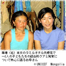 以前、このゴビ県のエルデン地方では、5人にひとりの子どもは定期的な体重測定をしておらず、3人に2人は幼稚園に通っていませんでした。ユニセフの支援が始まって1年たった2004年夏の時点で、町長さんを中心とする地元政府の懸命な努力とボランティアたちの献身的な努力のおかげで、5歳までの10人に9人は定期的成長記録をつけており、7歳までのすべての子どもが家庭訪問などを含む何らかのかたちでケアを受けたりできるようになりました。
