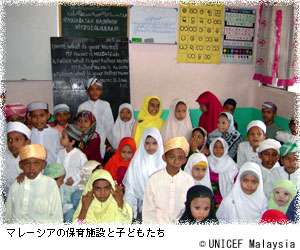そんな中で、マレーシア政府が現在、ユニセフと共に行っているプロジェクトの中で、特に重要なのが、0歳から5歳までの乳幼児保育と母子教育の拡充です。2004年に限ってみてみると、ユニセフとマレーシア政府は、12ヶ所の育児施設の運営形態の改善を図り、子どもとその親が一緒になって、乳幼児教育・そして保護を進められるシステムを作り上げようとしました。特に貧しい家庭の子どもたちにとっては、これらの施設がなくてはならないものになりました。2005年度以降、マレーシア政府は、これらの施設をお手本として、乳幼児に優しい保育施設をユニセフやNGOと共に、拡大してゆく予定です。それによって、親の負担を軽減し、乳幼児に対する虐待や放置等を減らしてゆこうというプランです。現在の試算では、およそ1億5千万円で新たに14ヶ所の保育施設を整備し、2000人程の乳幼児(特に保護者のいない子どもや、虐待の犠牲者)にサービスを提供してゆきたいと考えています。
