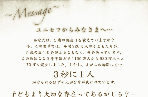 この言葉をあらためかみしめるとき、私たちは、子どもの死亡数が減ったことへの喜びよりも、920万人のひとりひとりかけがえのない子どもたちが、今この世にいないという事実に、やはり、受け入れがたい思いを感じるのです。