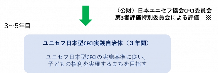 CFCIに取り組むことを決めた自治体は、申請書の提出によりCFCI候補自治体として2年間で準備/検証作業を進めます。準備/検証のプロセスを経て事業の自己評価を行った後、(公財)日本ユニセフ協会CFCI委員会第三者評価特別委員会によって評価がなされ、承認されるとCFCI実践自治体として、CFCIの実践に本格的に取り組むことになります。CFCI実践自治体は、3年ごとに第三者評価特別委員会による評価を受けます。