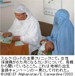こうした仕事以外に、今年はもうひとつ重要な役割がこの移動保健班に追加されました。それは1歳未満の子ども全員を出生登録する役目です。内務省と保健省は、ユニセフの支援を得て、2003年末までに出生登録システムを確立し、ポリオの予防注射と連動させて、100万人の出生登録を目指す活動に取り組んでいます。女性の移動にさえ規制を課す文化の中では、こちらから出かけて出生登録を行うことは重要なことです。ポリオの予防接種チームは、すでに長い経験を持ち、地元での信頼と尊敬、ステータスを勝ち得ていますから、出生登録キャンペーンを繰り広げるにはぴったりなのです。