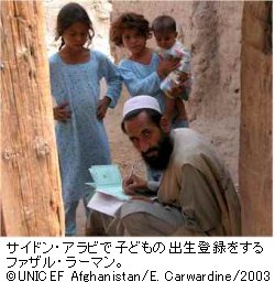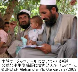 地理的な面でも、広報の面でも厳しい条件下にあるアフガニスタンで出生登録を実施するのは決して楽なことではありません。でも、最初の出生登録が済めば、子どもへのサービスを計画したり管理したりできるようになります。ユニセフは、地域レベルで、データの入力を行うスタッフの研修や編成を支援しています。これらのデータは、子どもの数を正確に把握していなければならない地区レベルの役人に提供されます。また、このプログラムを通して、アフガニスタンのすべての子どもたちのアイデンティティが保障され、彼らが児童労働の犠牲になったり、違法な養子縁組、早婚、子どもの人身売買の犠牲になったりする危険性を減らすことができます。