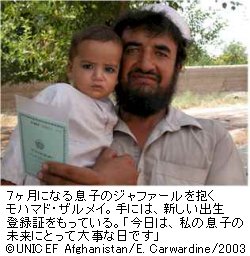 これはモハマド・ザルメイが気にしているところでもあります。実は、7カ月になる息子ジャファールが今日、ポリオの予防接種を受け、出生登録証をもらったばかりなのです。子どもは8人いますが、一番小さなジャファールだけが出生登録を受けたのです。それだけに、彼はことの重要性を認識しています。