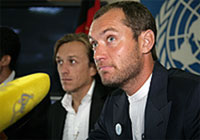| 「国際平和の日」の促進のために訪れたアフガニスタンで記者会見を行った映画俳優ジュード・ロウ氏とディレクターのジェレミー・ギリ氏。 |