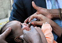 | 武力衝突が続く地域の子どもたちのために、「国際平和デー」を使ってアフガニスタン全国ポリオ撲滅キャンペーンを実施。写真はポリオ・ワクチンの投与を受けるアフガニスタンの子ども。 |
