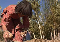 | バーミヤンで、ポテトを拾う幼い女の子。ひどい干ばつと食糧配給トラックへの襲撃で、食糧の供給がより難しくなっています。 |