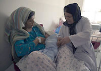 | アフガニスタン北部バルク州のマザール・エ・シャリフ町にあるサレハ・バヤト病院で、母乳を与える際の赤ちゃんの抱き方を母親に教える女性医師。 |