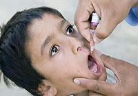 | アフガニスタン南部の町カンダハル近郊のヘラト・バザールにあるポリ診療所の外で、経口ポリオワクチンを投与される男の子。 |