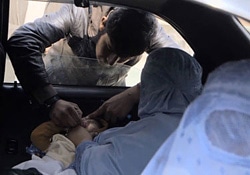 ニクザッドさん は手招きして子どもたちをトラックから降ろし、子どもの小さな指をチェックしました。数日以内にポリオの予防接種を受けている子どもは、指に紫のインクでつけたしるしがあるからです。子どもたちが予防接種を受けていないことを確認すると、ニクザッドさんは保冷ボックスを開け、ポリオワクチンを取り出しました。ワクチンは常に2-8度に保たれています。