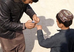 | カブールのPul-e-Charkhi検問所でチェックを受ける男の子。この検問所では、10歳以下のすべての子どもへの予防接種の実施を試みている。 |