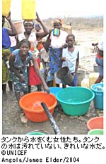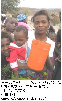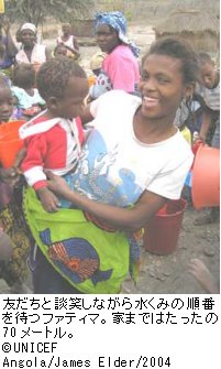 しかし、今週発表されたアンゴラの飲料水の普及率が50パーセント上昇したという報告にも関らず、マブイア村は例外的なケースのままです。約30年にもわたる戦争の結果、アンゴラ全体の給水システムは壊滅的な被害を受け、数百万人もの人々がきれいな水と基礎的な衛生設備を奪われました。この報告によると、アンゴラの衛生事情は悪化しています。基礎的衛生設備の普及率は、都市部で62%から56%に、地方では19%から16%に低下しているのです。ユニセフはこの状況に対して、アンゴラ全土で井戸を掘ったり、主要なパイプラインを建設したり、全国的な衛生教育キャンペーンを行っています。ユニセフはまた、学校に水を供給する作業も引き続き行っています。「安全な飲料水がどのような影響をもたらすのか−それはファティマとセリーナを見れば一目りょう然です」とユニセフ・アンゴラ事務所代表のマリオ・フェラーリは言います。「貧困にさいなまれている人々に、きれいな水や適切な衛生設備を提供することは、彼らの生活に劇的な成果をもたらすのです」