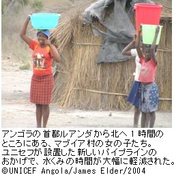 2000年、マブイアの村の子どもたちの驚くべき死亡率の高さに対処すべく、ユニセフはアンゴラ政府と協力して川から町へと水を運ぶパイプラインを設置しました。さらにトイレや手洗い場、蛇口やシャワーを作り、ろ過システムを取りつけて、一滴たりとも飲料に適さない水がないようにしました。その結果は目を見張るものでした。下痢を起こすケースはほぼゼロになり、子どもの死亡率が急激に低下しました。数時間の道のりを歩いて水を汲みに行かなければいけない重労働から突然解放された女の子たちは学校に行くようになりました。お母さん達は農作業に時間を使うことができるようになり、家族の収入が増えて、より多くの種類の食べ物やかや(蚊帳)を買うことができるようになりました。さらに、ユニセフはコミュニティの水と衛生委員会の設立を手伝い、今ではこの委員会がシステムのメンテナンスを行うとともに、コミュニティの人々に衛生に関する知識を提供しています。給水システムは村の委員会によって確実に維持されるようになり、ユニセフは新しいプロジェクトに取り組むことができるようになりました。