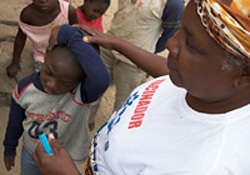 ルアンダにたくさんある貧困地域の一つ、コゼンガでは、コミュニティ・ボランティアが主導して、子どもたちが予防接種を受け、その家族がより健康的な生活を送っているかどうか確認するようにしています。ユニセフやWHO等その他のパートナーにより支援された、パストラル・デ・クリアンカというグループのプログラムでは、コミュニティ・リーダーを選出し、自分たちの地区の家庭の健康を監視できるようにトレーニングを実施しています。コミュニティ・リーダーとなった各ボランティアは10世帯を任され、その世帯は定期的な検診や予防接種を受けることになります。
