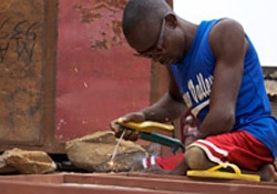 | リカルド・モンティロさんは、窓と扉を溶接することを学んでいます。彼は3歳の時ポリオに罹りました。学校に戻って看護師になる勉強をするため、お金を稼ぐ決意をしました。 |