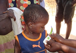 | アンゴラのある地域で、栄養状態を確認するため、4歳の男の子の二の腕の直径を測っている地域のボランティア。子どもたちの健康問題の解決のために、地域に根ざしたこうした活動が、最も効果的だということが実証されてきている。 |