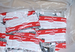 | 重度の急性栄養不良の子どもたちに、治療センターで提供される「プランピー・ナッツ」。家庭でも摂り続けられるこの治療食のお陰で、子どもたちは、完治していなくても家庭に戻る事ができ、また、家庭でも、継続的な治療ができる。 |