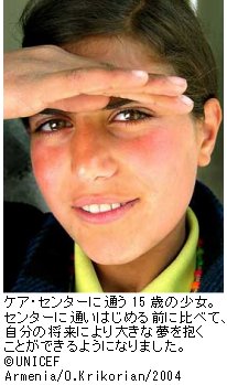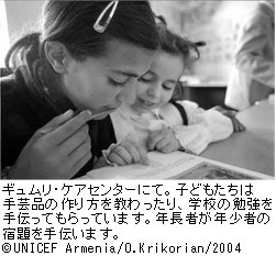 2001年以降、ユニセフは危機的状況にある子どもたちと障害がある子どもたちのための代替ケア・センターの設立を推進しています。これまでオーストリアとオランダのユニセフ国内委員会の資金援助によって、このようなセンターがアルメニアの貧しい5つの地域につくられました。