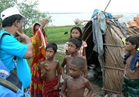 | バングラデシュの沿岸部を襲ったサイクロン「アイラ」によって住む場所を失ったパドマプルから避難してきた人々を訪れるユニセフの支援チーム。この地域の人々は、高台に仮の住まいを立てている。 |