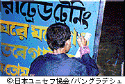 ユニセフは、子どもたちが働き続けながら勉強し、職業訓練を受けることのできる事業を進めています。例えばチッタゴンにある恵まれない子どもたちのための学校。この学校のスタッフは、駅やスラムに出かけ、学校に通えそうな子どもを探します。学校に興味を示して通ってきた子どもは、順番に入学していきます。入学にあたっては、「子どもをきちんと学校に通わせます」という誓約書を親に提出してもらいます。親の都合で、子どもが中途退学しないようにとの配慮からです。