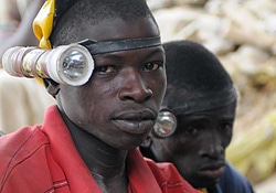頭に懐中電灯をつけて金鉱山のトンネルの中で働く15歳のボウクン・ブレイマ・ハウマくん。 |