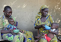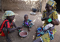 | カメルーン北部のチョンチ村で、マボウレさんの5歳の娘のデボウラ・モルゾネちゃんが、双子のひとり、チト・アンナちゃんに“ニリ”を食べさせています。マボウレさんは、もうひとりのエスターちゃんに食事を与えています。 |