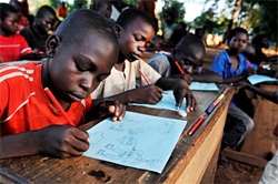 | ボッサンゴアの「子どもにやさしい空間」で絵を描く子どもたち。 |