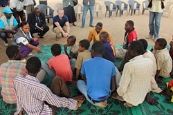 | チャドの避難施設で家族と離れ離れになった子どもたちの話を聞くフォンテーン代表。 |