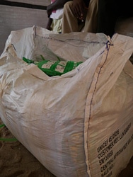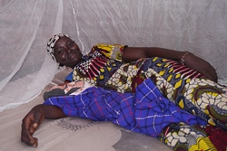 | 避難所でユニセフが配布をしている、殺虫処理がされた蚊帳。 |