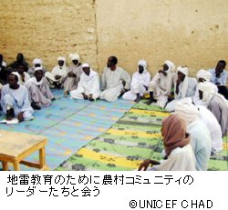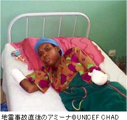 「危険なものが多すぎて、どれが安全でどれが危ないかなんて分かりません」とアミーナ。だからこそ、政府が人々に地雷や不発弾の怖さについて教育する必要性があるのだと言います。チャドには、地雷アクション・プログラムを担当している国立機関「地雷除去国立高等弁務官事務所」という組織があり、地雷教育チームを編成していますが、まだ立ちあがったばかりです。今のところ、地雷教育プログラムを受けたことがあるコミュニティはそんなに多くありません。ユニセフは、国立地雷除去高等弁務官事務所に技術的・物質的な支援を送り、国家的に地雷教育を行ってもらおうとしています。地雷の被害を一番受けている地域やコミュニティから重点的に地雷教育をしてもらおうというものです。アミーナのような悲惨な運命を防ぐにはこれしか方法がないのです。