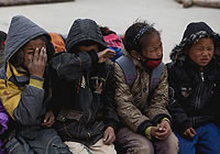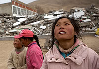 | 中国青海省の震源地域、玉樹県で屋外に座る子どもたち。地元当局は、この地域の小学校の80パーセント、中学校の50パーセントが深刻な被害を受けたと伝えている。 |