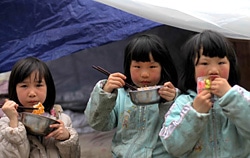| 避難生活を送るテントの前で食事をとる子どもたち。 |
